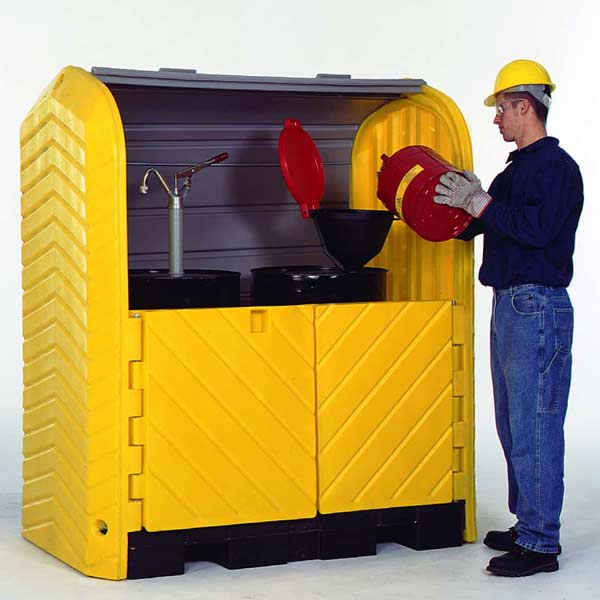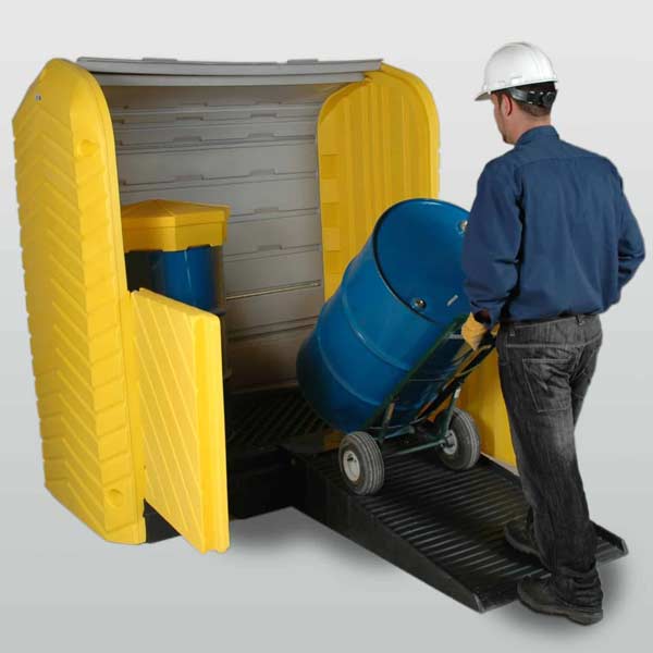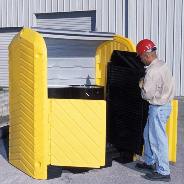 - Flexible Operation: Front doors swing wide to allow access to drums pre-loaded on wooden pallets. The unit is suitable for industrial outdoor storage, chemical handling facilities, and any operation requiring secure and accessible drum containment.
