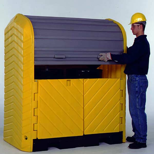 - Security and Safety: The roll-top cover and swing-out doors can be locked with a standard padlock to prevent unauthorized access. The containment sump captures leaks or spills, protecting property and the surrounding environment from hazardous materials.