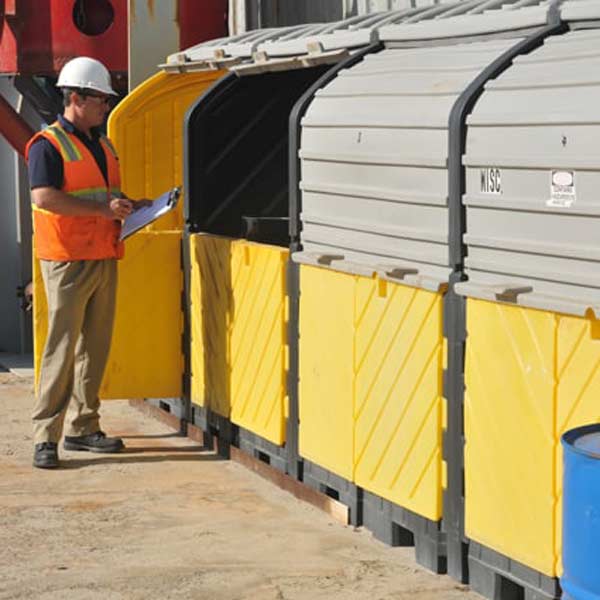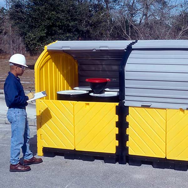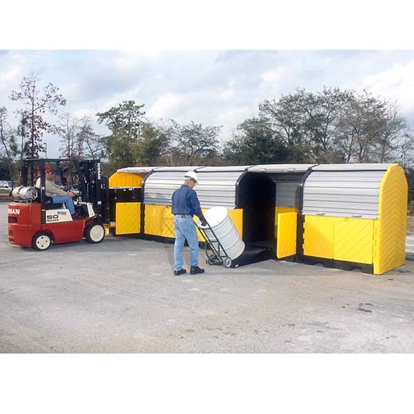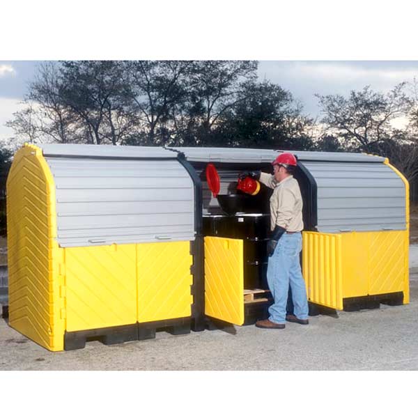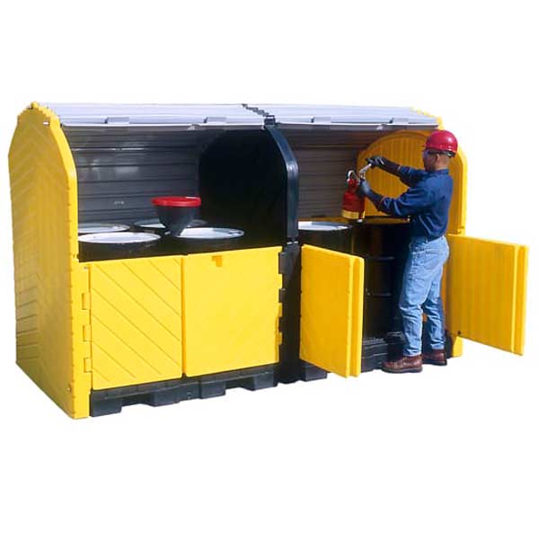 Multiple four drum compartments are incorporated into the system, providing structured separation for different materials or waste streams. Internal walls and separate sumps keep incompatible substances isolated, enhancing overall safety and helping facilities maintain compliance with environmental regulations. Lockable compartments add an additional layer of security and include a two way entry system that allows access to all four drums without repositioning equipment. Swing out doors support safe loading and unloading operations.