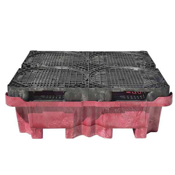 The four-drum spill containment pallet simplifies drum handling and containment. The top grate that is 4-way forkliftable so if drums need to be moved but the sump (also 4-way forkliftable) needs to remain in place, it can be easily done.